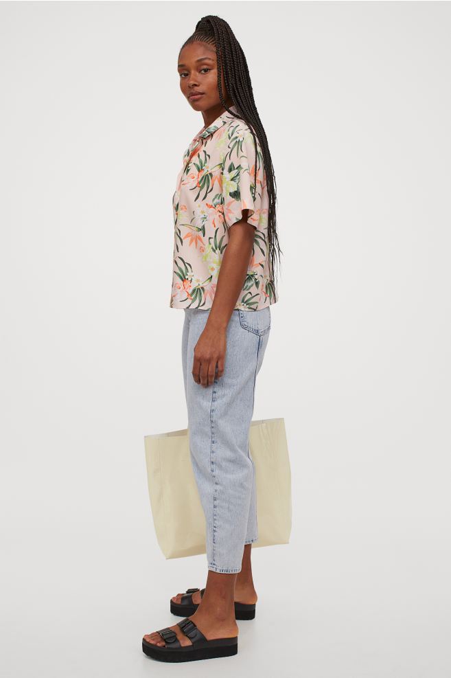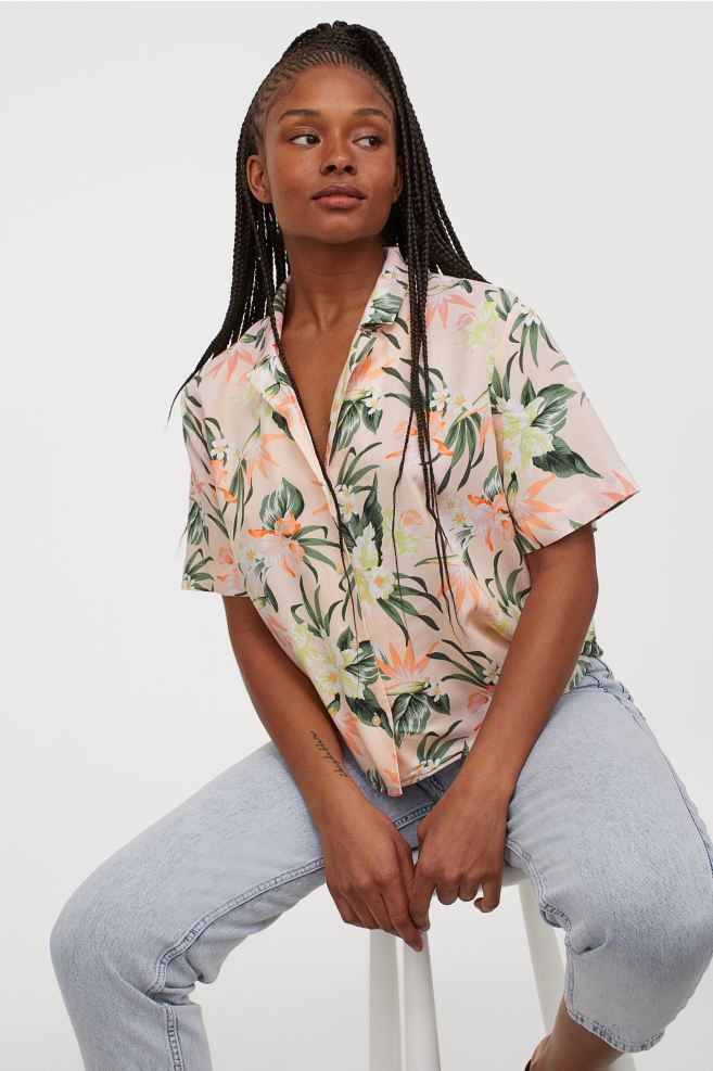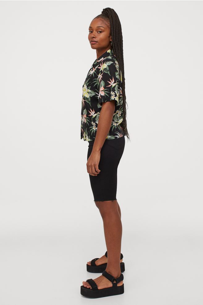 Chemise à manches courtes en tissu de viscose imprimé. Coupe carrée avec col cubain et boutonnage devant.